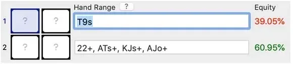 Nehmen wir zum Beispiel A5s gegen einen höheren Suited Connector, wie T9s. Wir vergleichen dies mit einer Calling Range von 22+, ATs+, KJs+, AJo+ (siehe die nachfolgende Grafik):