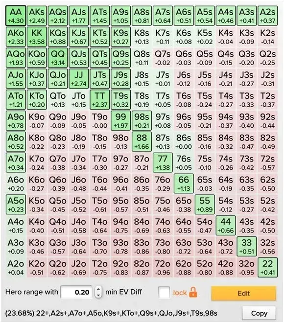 - Die nicht ganz so profitablen Shoves werden in einem viel schwächeren Grün angezeigt (zwischen +0,01 und +0,19bb pro Hand).